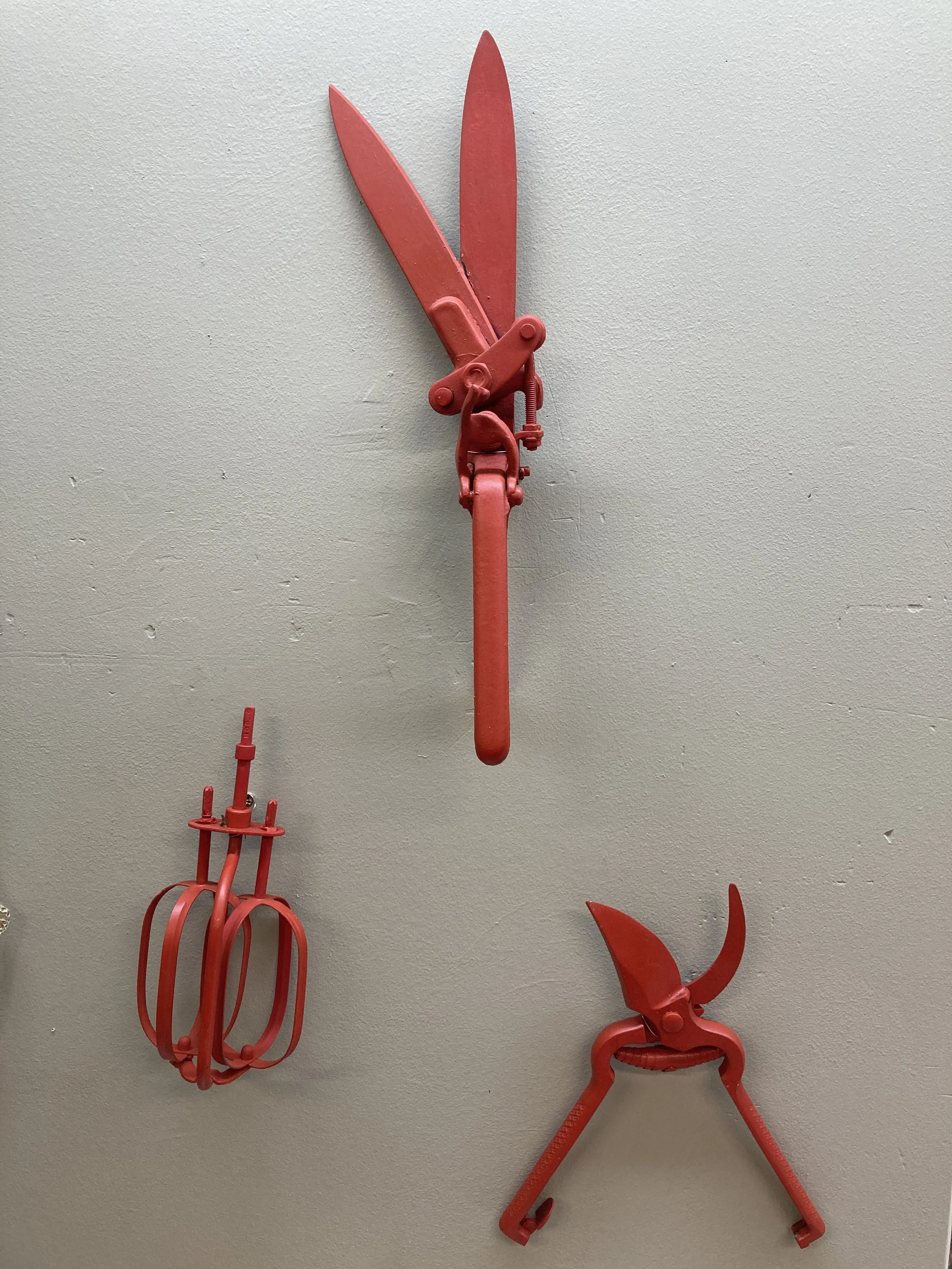 For months following my mom’s death, I painted ordinary household objects red. I painted forks, measuring spoons, tin cans, plates, egg beaters and garden shears. I found it soothing, being by myself in my studio, silently painting things red. I was struck by how the matte paint reduced objects to line and shadow and pure color. Ordinary objects became sculptural and I could see their beauty anew. I also made sketches of art installations I never wanted to make; they would be too awful. But, I am slowly revisiting this work. It makes sense to me now and no longer looks awful; it looks relatable.